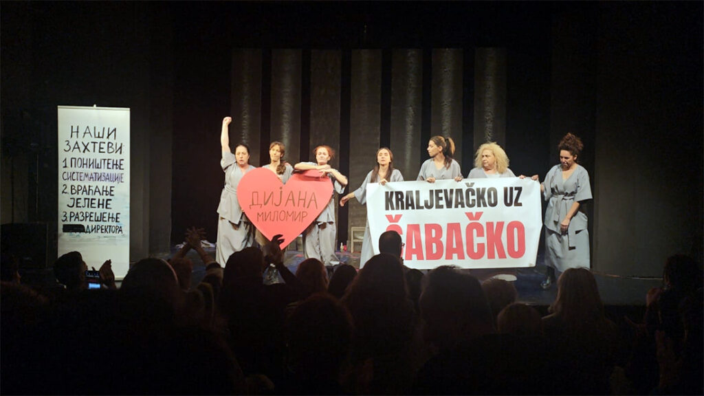 Međutim, aplauz na kraju predstave bio je toliko veliki da se nasilno osustvo trećine sale nije ni primetilo. A „zemljotres“ oduševljenja dogodio se kada su hrabre glumice pred publiku izašle sa srcem na kojem je pisalo Dijana, Milomir, transparentom sa porukom „Kraljevačko je uz Šabačko“ i banerom sa zahtevima šabačkih glimaca.
