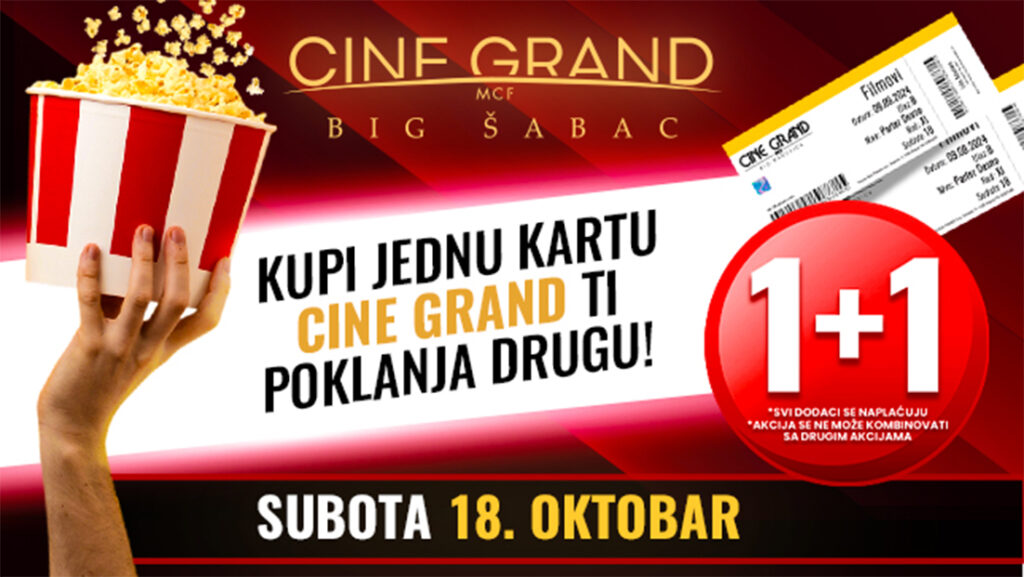 Posebna akcija čeka sve ljubitelje filma u subotu, 18. oktobra – uz jednu kupljenu kartu, drugu dobijate gratis! Osim filmske zabave, posetioci će moći da učestvuju i u kreativnim radionicama, koje će obogatiti bioskopsko iskustvo i pružiti priliku najmlađima da se zabave.Istovremeno, svi posetioci moći će besplatno da postanu članovi „Film klub“ programa lojalnosti.