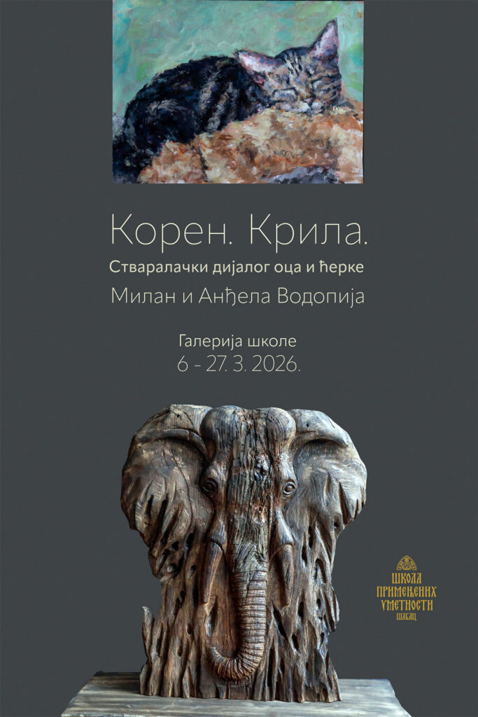 U galeriji Škole primenjenih umetnosti, u petak 6. 3. 2026. godine, u 17.00 časova biće otvorena izložba Koren. Krila (stvaralački dijalog oca i ćerke) – zajednička izložba radova nekadašnjeg učenika Škole primenjenih umetnosti Milana Vodopije i sadašnje maturantkinje Anđele Vodopije.