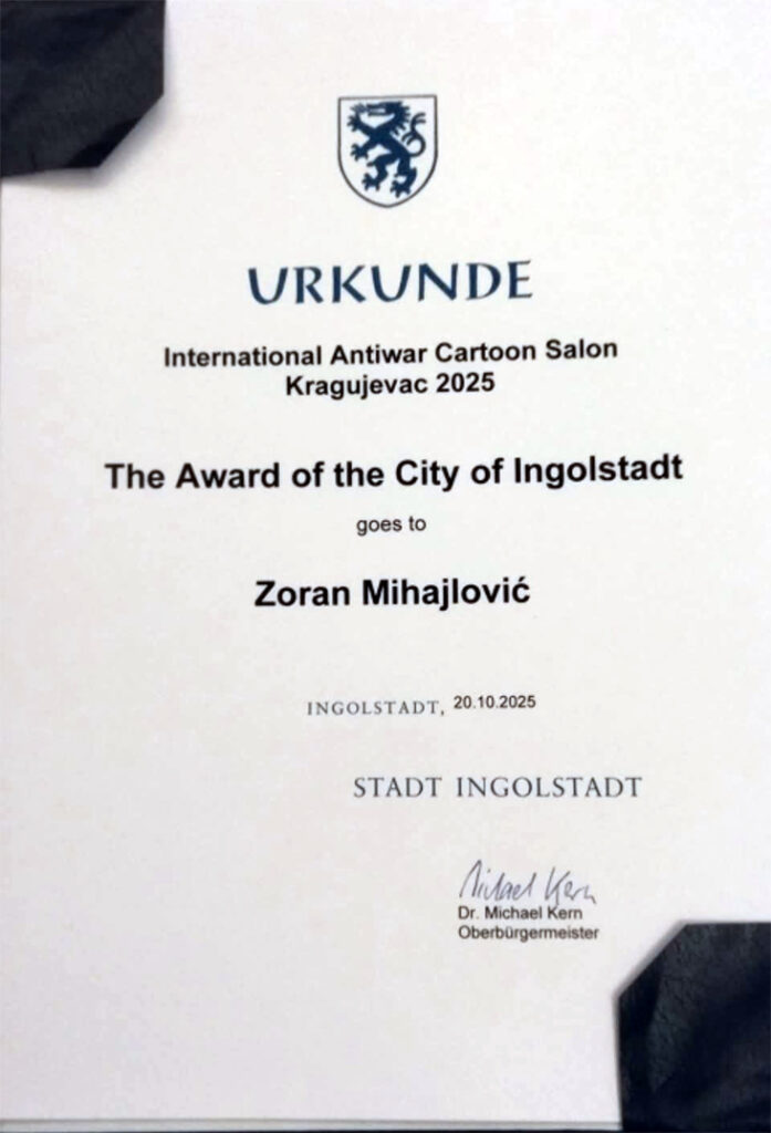 Asocijacija gradova vesnika mira, grad Kragujevac i gradovi pobratimi, uručili su, na tradicionalnoj manifestaciji „Bdenje“ 20. oktobra 2025. godine u Muzeju „21. oktobar“, nagrade dobitnicima 23. Međunarodnog salona antiratne karikature a među nagrađenima našao se i karikaturista iz Ljubovije Zoran Mihajlović Zoća.