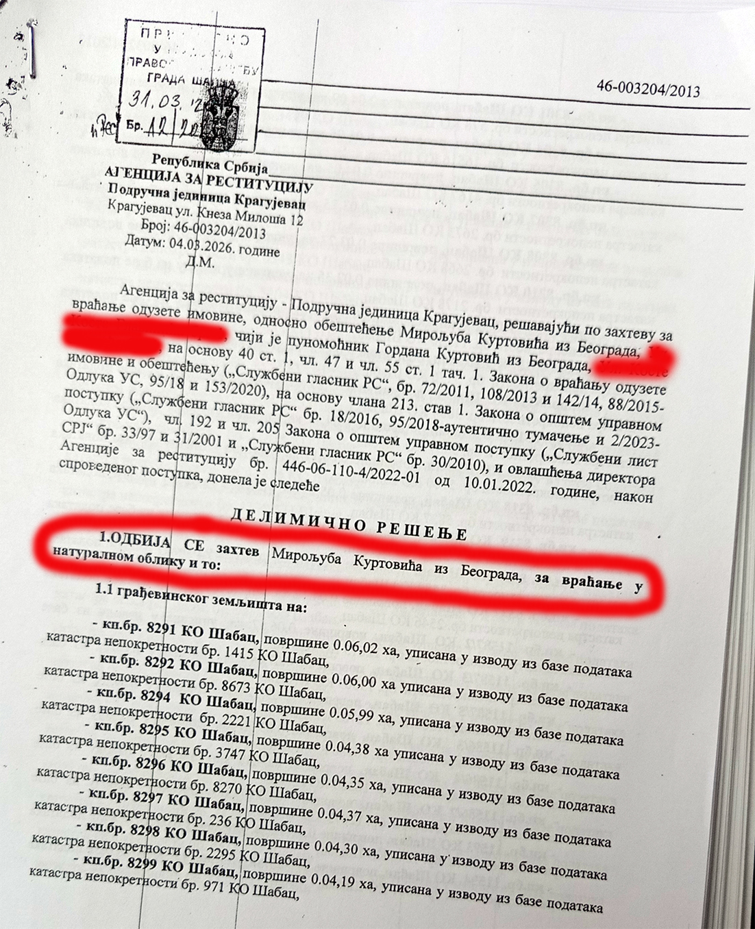 Agencija za restituciju odbila je zahtev Miroljuba Kurtovića za vraćanje imovine u naturalnom obliku. Zahvaljujući gospodinu Marjanu Dukiću “Podrinske” su došle do dokumenta u kojem je Agencija za restituciju – Područna jedinica Kragujevac, na preko sto kucanih strana, objavila skoro 2.000 katastarskih parcela na koje Miroljub Kurtović nije imao pravo da u Katastru nepokretnosti uknjiži zabeležbe.