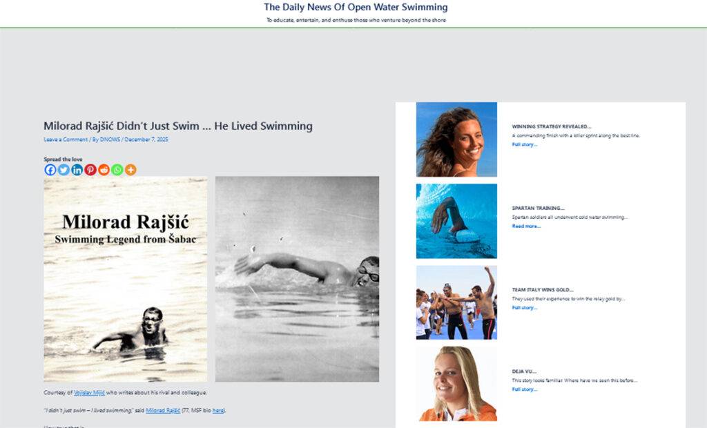 Na eminentnom svetskom sajtu, https://dailynewsofopenwaterswimming.com/milorad-rajsic-didnt-just-swim-he-lived-swimming/, “Dnevne vesti o plivanju na otvorenim vodama” (The Daily News of Open Water Swimming), 7. decembra, pojavila se i biografija legende šabačkog maratonskog plivanja, Savskog Vuka, Milorada Rajšića, “Milorad Rajšić nije samo plivao… On je živeo plivanje“ (Milorad Rajšić Didn’t Just Swim … He Lived Swimming).