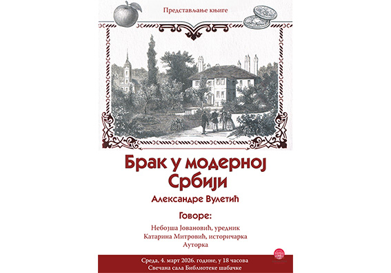 U sredu, 4. marta 2026. godine, u 18 časova, u Svečanoj sali Biblioteke šabačke biće predstavljena knjiga „Brak u modernoj Srbiji“ dr Aleksandre Vuletić. Pored autorke, o delu će govoriti urednik Nebojša Jovanović i istoričarka Katarina Mitrović. Brak je najstarija i najvažnija društvena institucija u kojoj se prepliću i sukobljavaju interesi države, crkve, društva i pojedinca. Ova knjiga sagledava brak kroz uticaje pomenutih aktera u Srbiji XIX i XX veka – u vreme stvaranja moderne države i društva.