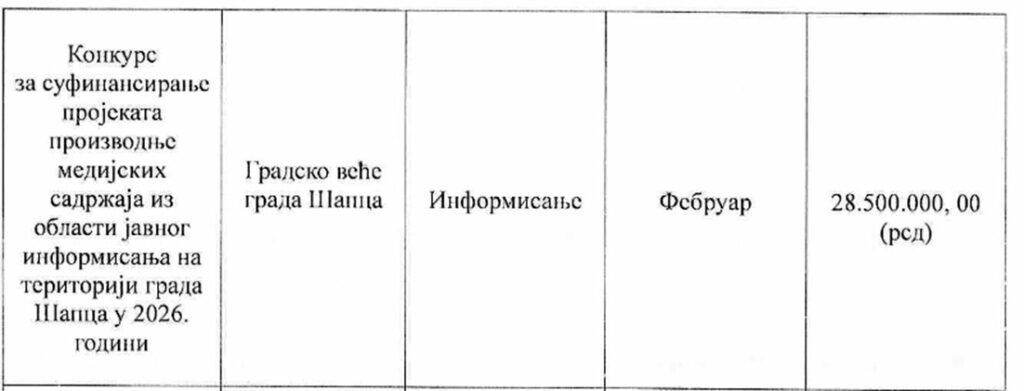 I, tako, dok gradovi širom Srbije već raspisuju konkurse za sufinansiranje medijskih sadržaja, u Šapcu, ništa, tišina. Iako je Godišnjim planom konkursa za 2026. godinu predviđeno da ovaj konkurs bude raspisan do kraja februara to se nije dogodilo. Nema javnog poziva, nema najave, nema objašnjenja. Samo praznina tamo gde bi trebalo da stoji poziv medijima da konkurišu za projekte od javnog interesa.