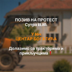 „Poljoprivrednici koji su podržavali proteste sada su na meti režima! Svakodnevne inspekcije, pritisci, pretnje i tortura, sve samo zato što ne ćute. Represija prema poljoprivrednicima jednaka je represiji prema studentima. Danas oni, sutra svi mi. Danas u 16h, Centar Bogatića. Dolazimo sa traktorima i priključcima! U znak podrške svima koji trpe pritisak, okupljamo se i ne ćutimo“, navodi se u pozivu na društvenim mrežama.