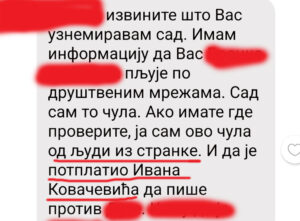 „Hhhhh (ime), izvinite što Vas uznemiravam sad. Imam informaciju da Vas Hhhhhh hh Hhhhhh (ime i ime firme) pljuje po društvenim mrežama. Sad sam to čula. Ako imate gde proverite, ja sam ovo čula od ljudi iz stranke. I da je potplatio Ivana Kovačevića da piše protiv Hhhh (ime firmr)…“ (imena su nebitna).