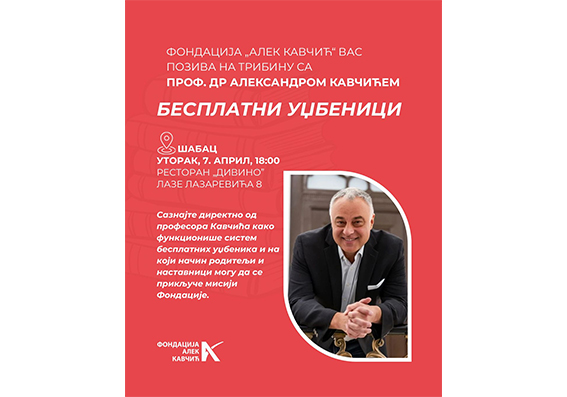 Fondacija „Alek Kavčić“ poziva na tribinu posvećenu temi besplatnih udžbenika, koja će se održati u utorak, 7. aprila, sa početkom u 18 časova, u restoranu „Divino“, Laze Lazarevića 8 u Šapcu.