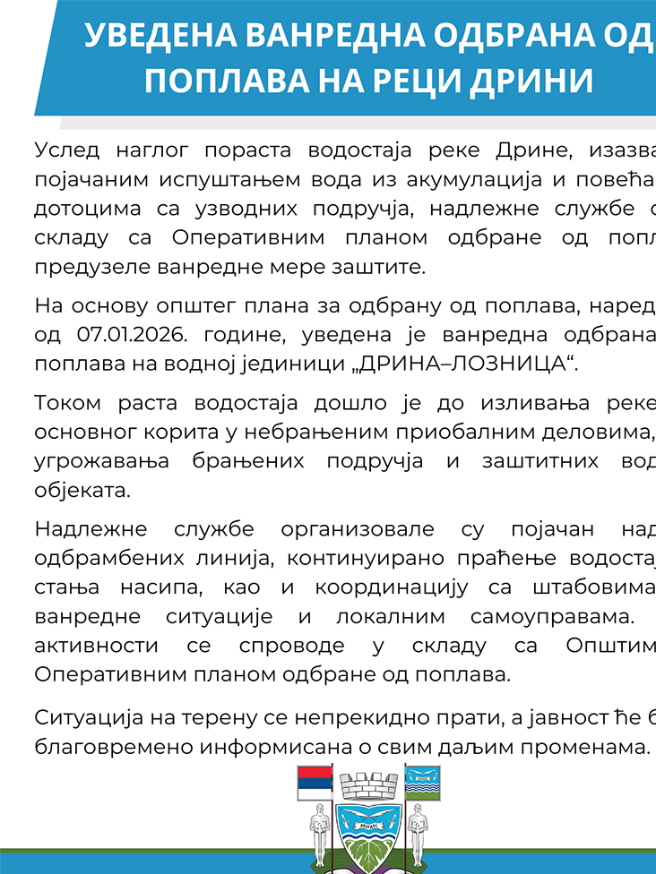 Na osnovu opšteg plana za odbranu od poplava, narednom od 07.01.2026. godine, uvedena je vanredna odbrana od poplava na vodnoj jedinici „DRINA–LOZNICA“.