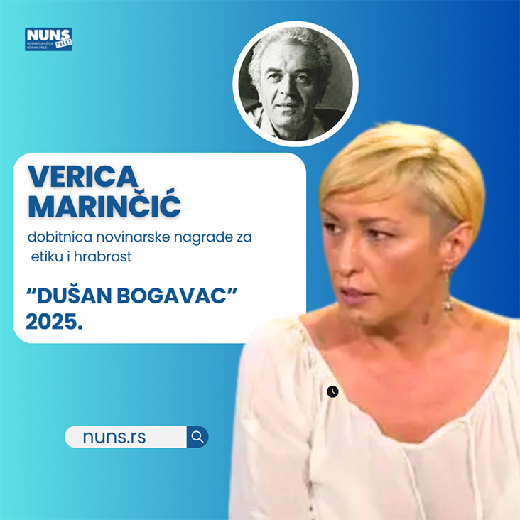 Žiri Novinarske nagrade za etiku i hrabrost „Dušan Bogavac“, koju dodeljuju Nezavisno udruženje novinara Srbije (NUNS) i Fondacija „Dušan Bogavac“, odlučio je da laureatkinja za 2025. godinu bude novinarka Verica Marinčić, urednica portala In medija iz Inđije. Njoj će nagrada svečano biti uručena u sredu, 22. oktobra, u 12 časova, u prostorijama NUNS-a.